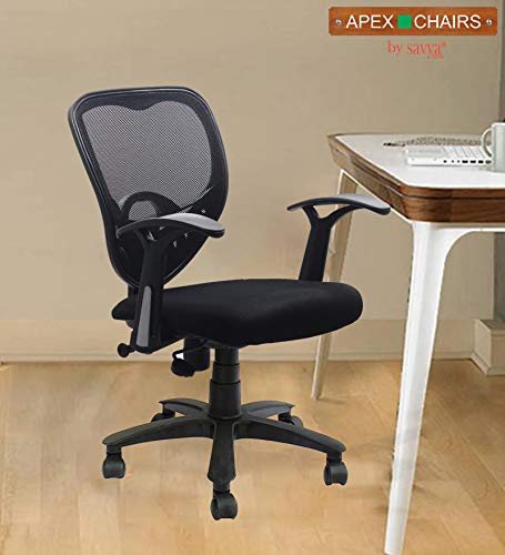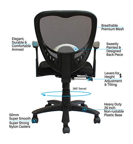 Primary Material: Ergonomic Co Polymer chair with black contoured meshback, Strong Plastic Armrest, Heavy Duty Plastic Umbrella Shape Base, Pneumatic 5-inch-seat height adjustment & 2-inch-thick padded seat for day long comfort.