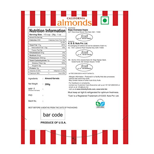 Tulsi California Almonds is one of the most nutritious of all nuts. It is a delicious nut which is crispy in taste, acts as the best buddy in the morning breakfast and as an anytime snack. Almonds are a source of vitamin E, copper, magnesium, and high-quality protein; they also contain high levels of healthy unsaturated fatty acids along with high levels of bioactive molecules (such as fiber, phytosterols, vitamins, other minerals, and antioxidants). Almonds are naturally gluten-free and are a versatile, nutrient-rich addition to gluten-free diets. Tulsi is a premium nuts and dry fruits brand. Tulsi brings you the best and the most nutritious daily dose of healthy nuts and dry fruits. At Tulsi, we bring the taste and health together in a single pack in the finest of packing. We believe in serving the best products to our customers and hence we travel across the world to procure the finest nuts and dry fruits. Our products are processed and packed in FSSC: 22000 & HACCP certified plant – The best among food safety ratings and certified by ‘FSSAI‘.