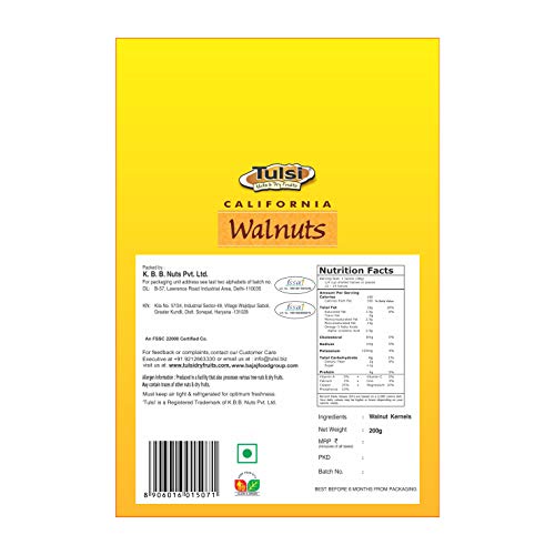 Tulsi California Walnut Kernels Premium is the crunchy and nutty taste of walnuts can accentuate the taste of any delicacy and amps up the health quotient. And an excellent source of several vitamins and minerals. Walnuts are most often eaten on their own as a snack. However, they can also be added to salads, pasta, breakfast cereals, soups, and baked goods. Walnuts are rich in protein. This vitamin may strengthen the immune system and support nerve health. A vitamin B6 deficiency may cause anemia. Keeping walnuts in their shells in a cool, dark, and dry place can improve their shelf life. Walnuts can be a healthful addition to the diet, they can also be added to salads, pasta, breakfast cereals, soups, and baked goods.